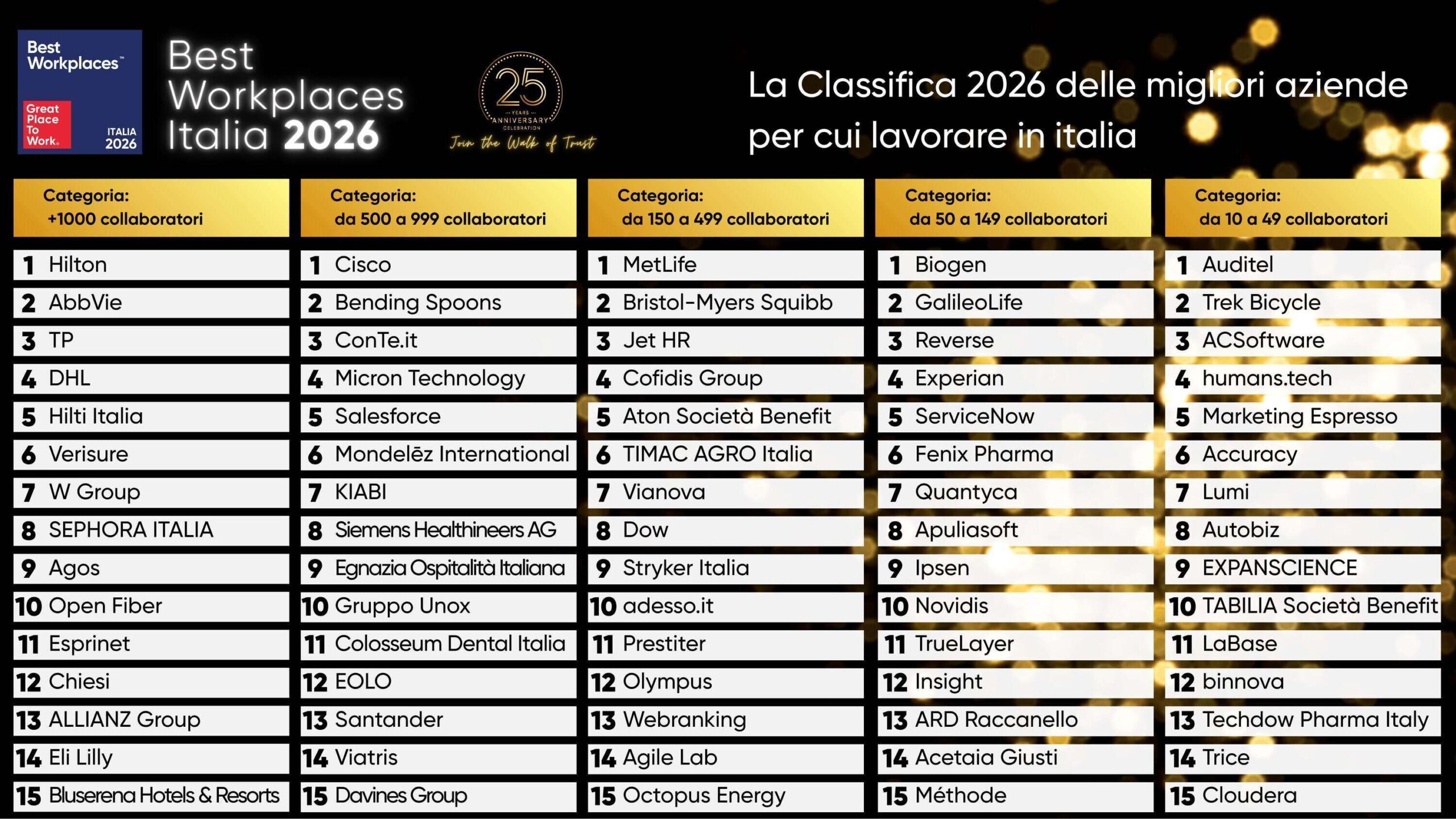 L’analisi qualitativa mostra segnali positivi sulla meritocrazia (73%, +2%) e sull’organizzazione di eventi speciali (90%, +2%), sebbene si noti una leggera flessione del 1% su benefit e flessibilità. Tra i fattori che rendono unico l’ambiente di lavoro, i lavoratori indicano il supporto (21%), l’atmosfera (13%) e la collaborazione (12%), mentre le aree di miglioramento richieste riguardano la retribuzione (19%) e i processi interni (17%). Per quanto riguarda le classifiche per dimensione, tra le aziende con oltre 1.000 dipendenti svetta Hilton, seguita da Abbvie e TP. Nella fascia 500-999 collaboratori, il primato va a Cisco, davanti a Bending Spoons e ConTe.it. Per la categoria 150-499 vince MetLife, seguita da Bristol-Myers Squibb e Jet HR. Tra le imprese con 50-149 dipendenti trionfa Biogen, con Galileo Life e Reverse SpA sul podio. Infine, nelle realtà tra 10 e 49 collaboratori, la medaglia d’oro va ad Auditel, seguita da Trek Bicycle e ACSoftware. Come ricorda Zollo, queste aziende mostrano performance economiche tre volte superiori alla capitalizzazione dell’S&P 500, confermando l’efficacia del cosiddetto Great Place to Work Effect.