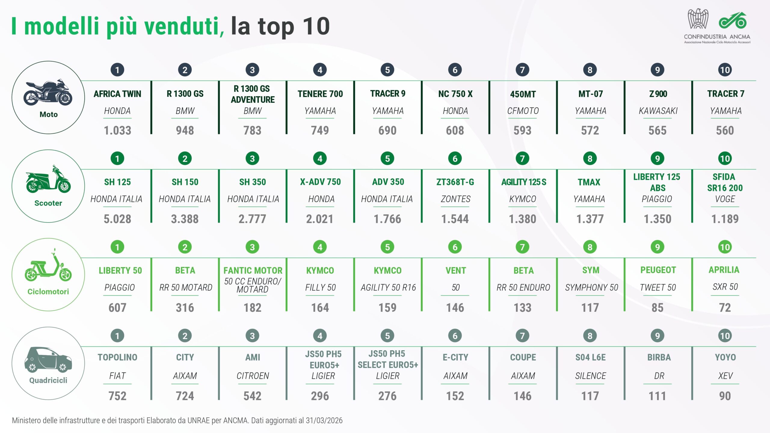 Nel corso del mese di marzo, il mercato ha confermato la sua crescita per la terza volta consecutiva, segnando un incremento del 22,31% con un totale di 40.721 veicoli messi in strada. Tra questi, spiccano i 22.664 scooter immatricolati, pari a un aumento del 28,38%. Le moto hanno registrato una progressione del 14,28%, corrispondente a 16.939 unità, mentre i ciclomotori sono saliti di 37,01 punti percentuali con 1.118 pezzi, sebbene il confronto avvenga con un marzo 2025 che aveva perso il 45%. Guardando all’intero trimestre, la crescita complessiva è stata del 14,77% con 84.788 immatricolazioni. In questo arco temporale, gli scooter hanno raggiunto le 46.386 unità (+14,65%), le moto le 35.637 unità (+13,93%) e i ciclomotori le 2.765 unità (+29,39%).
